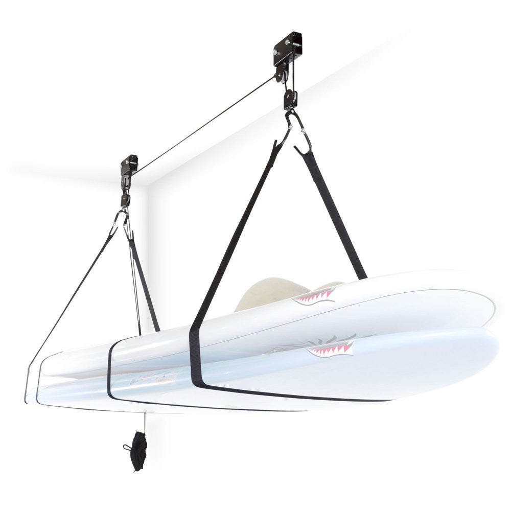 - Hoist and store (1) or (2) SUP paddle boards from a garage ceiling