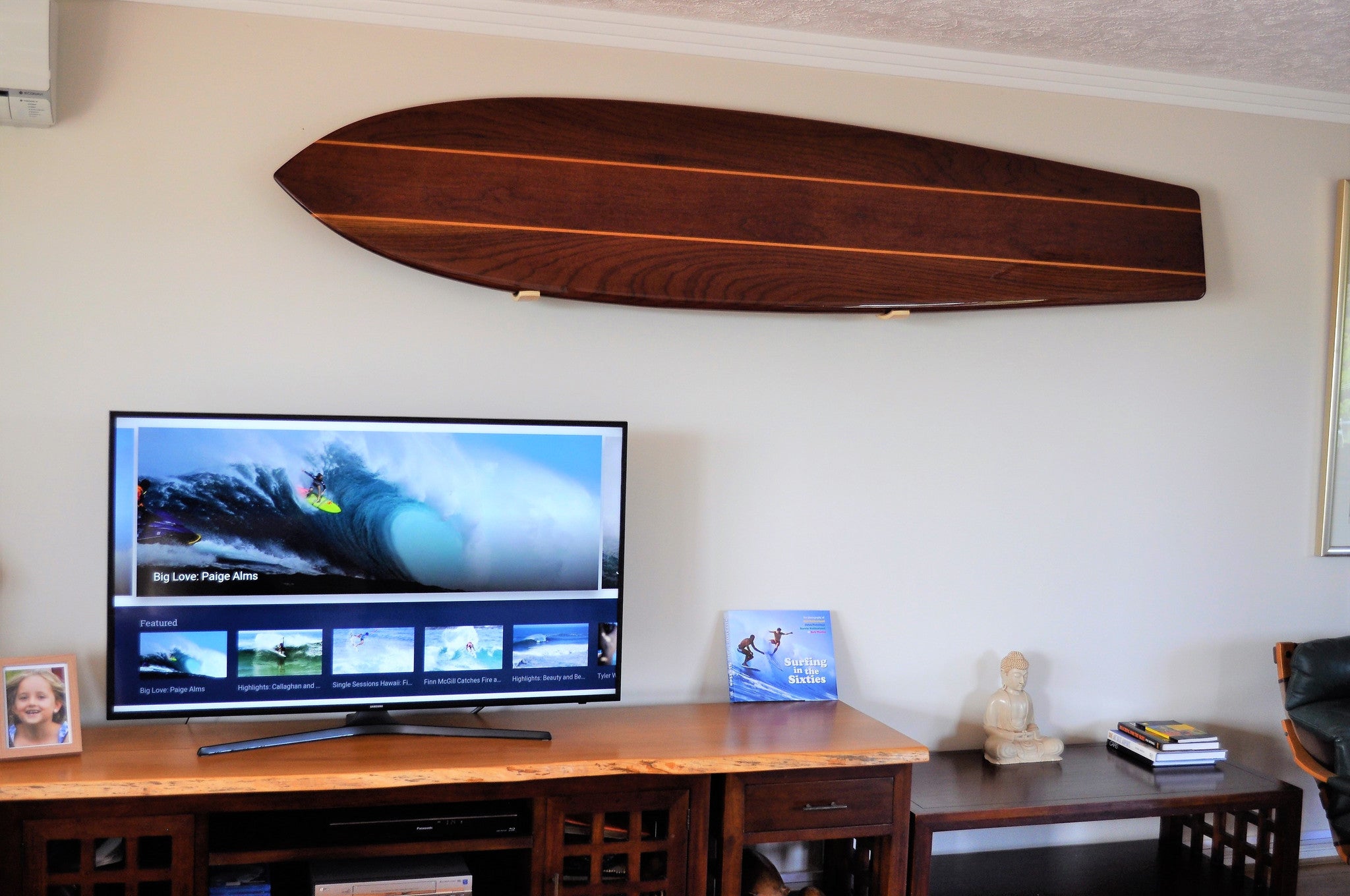 Beautiful wood finish looks just as good when your surfboard is off the rack