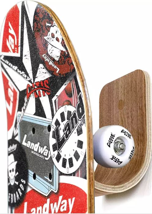 Skateboard is displayed flat to the wall to save space with deck facing out