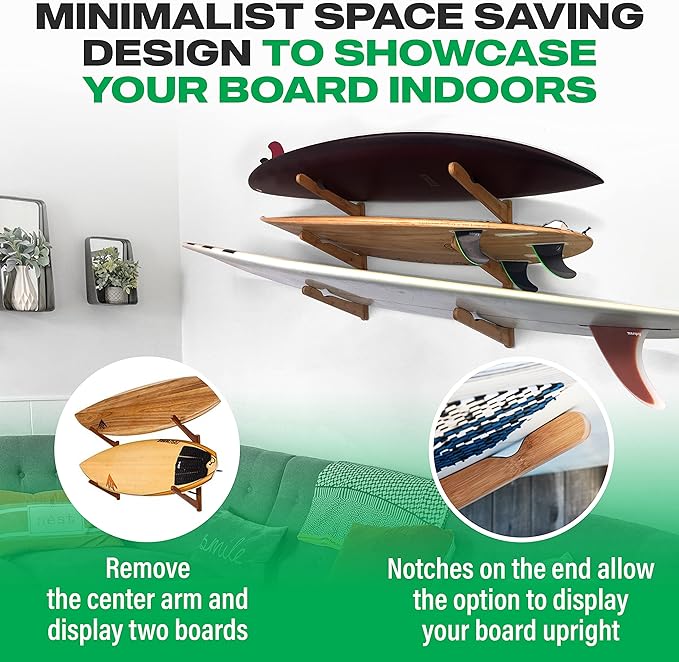 If you prefer to feature a board on display (eg a nice shape or spray to show off) there are indentations on the end of each arm which also allow you to display one or two boards in an upright position - showing off the full base or deck of your board!