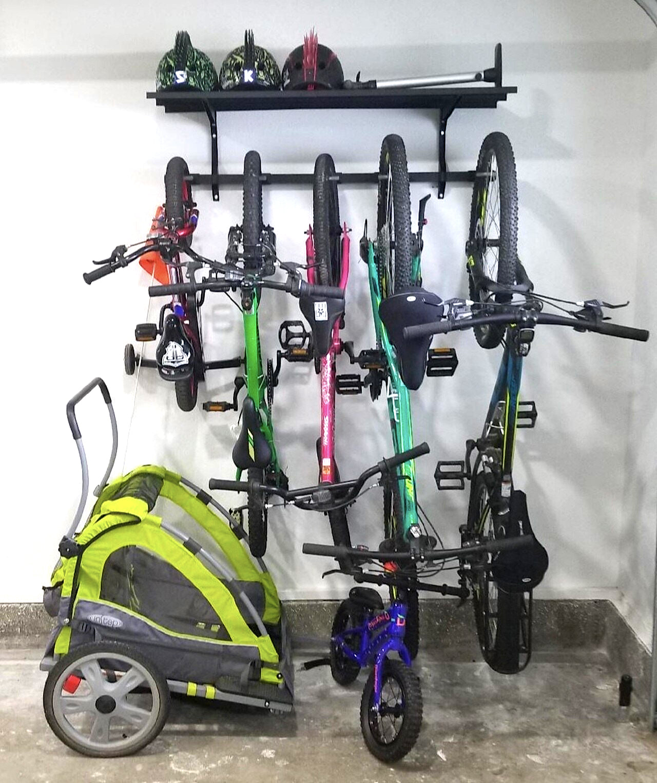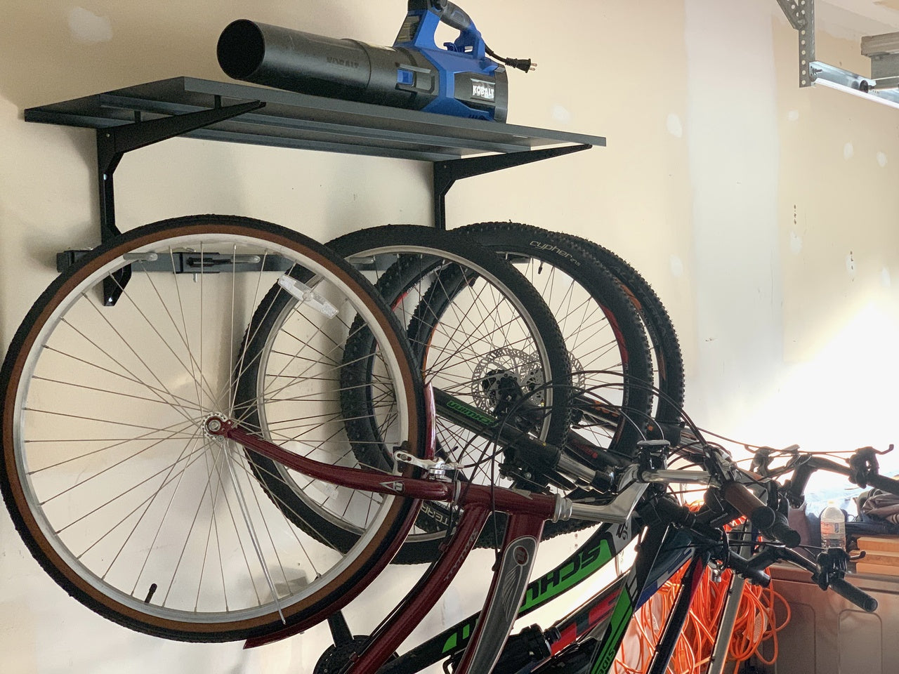Additional storage shelf Need extra storage for bike helmets, shoes, tire pump, tools and more? The heavy-duty storage shelf above the rack holds up to 45kg (evenly distributed) for even more storage space! Use it to store our storage bins, tool bags, bike parts, and more so everything is organized in one place.