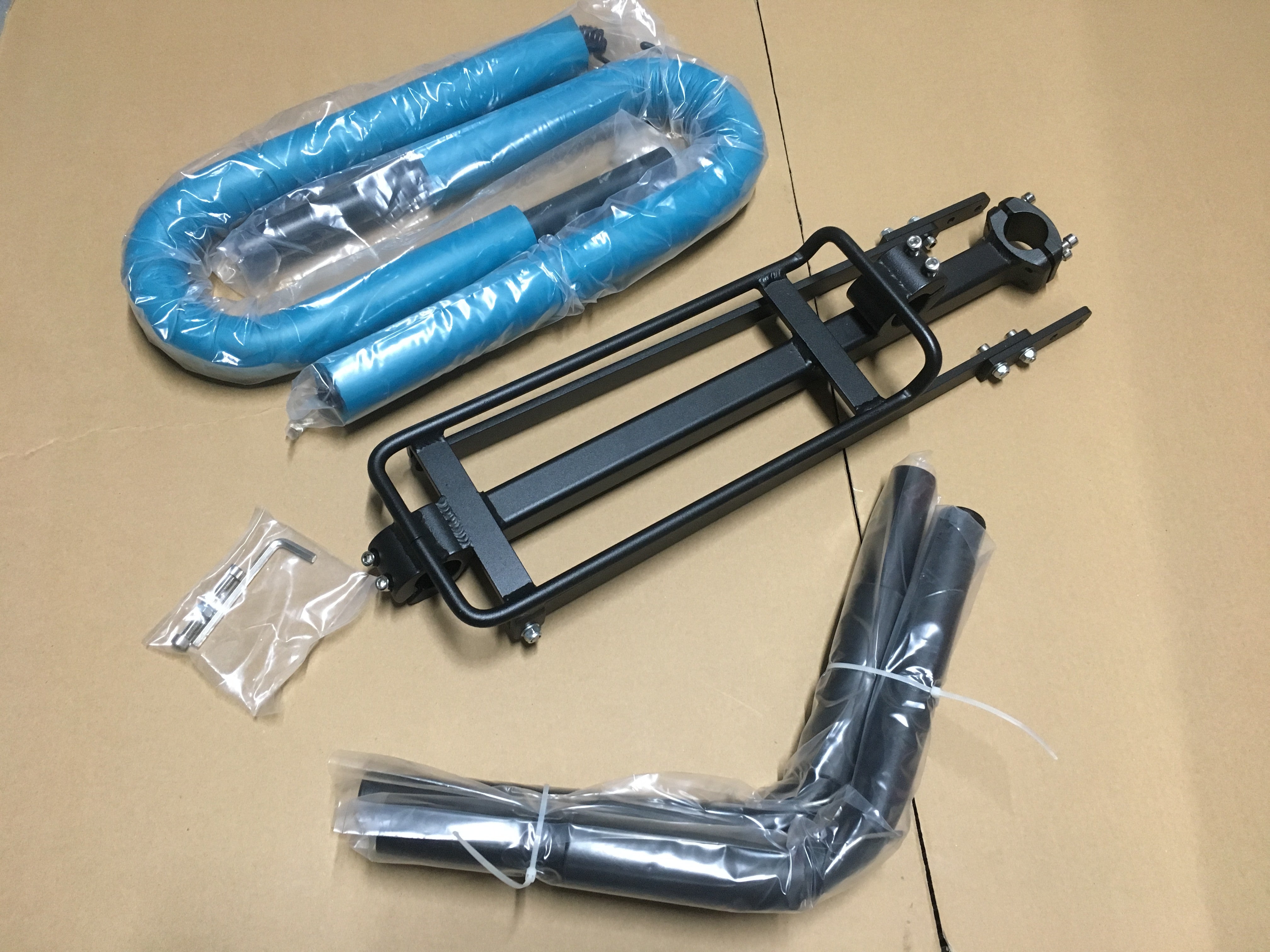 This universal fit bicycle surfboard carry rack is a powder coated alloy frame which fits to any standard seat stem and sits over the rear wheel with a secondary connection in the form of a pair of support bars which connect the rack to the rear frame at the axle.