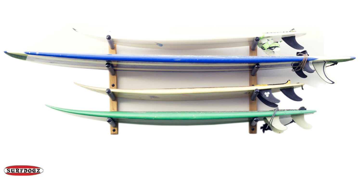 Surfboard Storage Rack NZ - QUAD wall rack for 4 surfboards - with Wooden Base - by Surf Dogz